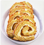 7.Carefully unroll the cooled cake and remove the paper. Spread the buttercream over the sponge then spread the apricot conserve on top. Gently re-roll and serve sliced.