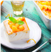 5. To make the orange glaze, soften the gelatine in cold water as in step one. Heat the orange juice in a small pan until almost boiling then remove from the heat. Squeeze the excess liquid from the gelatine leaf and stir into the hot juice until dissolved. Cool for 30-40 minutes, stirring occasionally until beginning to thicken. Pour over the chilled mousse then top with the diced orange flesh. Chill in the fridge for 2 hours, or until the glaze has set. Serve cut into squares decorated with fresh mint sprigs.