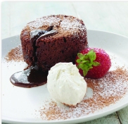 4. Divide the mixture between the four dishes. Place on a baking sheet and bake in the preheated oven for 15-20 minutes until the puddings have risen and are just set on the outside – the tops should still wobble when pressed lightly. Run a knife around the edge of the puddings and turn out onto plates. Dust with cocoa powder and icing sugar and serve immediately with whipped cream and strawberries.