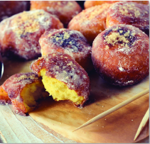 5. Half fill a large deep pan with vegetable oil and heat to 180°C/350°F, or until a cube of bread dropped in the hot fat browns in 30 seconds. Fry the doughnuts, 4-5 at a time, for 1-2 minutes on each side or until puffed and golden. Remove with a slotted spoon and drain on kitchen paper.